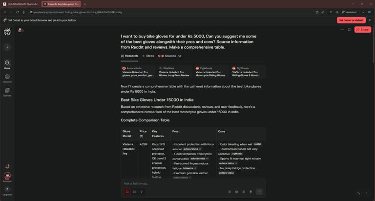 Example query results show sophisticated organization, like creating detailed comparison tables for “Bike gloves under Rs 5,000” with specifications, prices, and ratings.